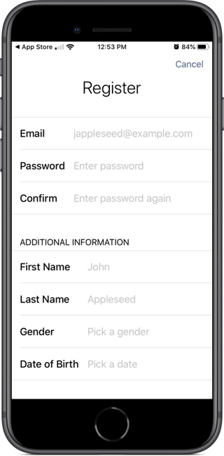 After downloading the myFHR app, you'll need to register your account. There are several ways to begin: