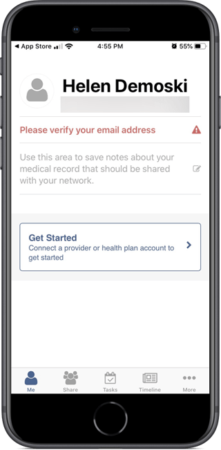 After you connect to Apple Health (iOS device users), myFHR will send you an email to verify your email address. If you don't receive the email, touch "Please verify your email address" to resend it.